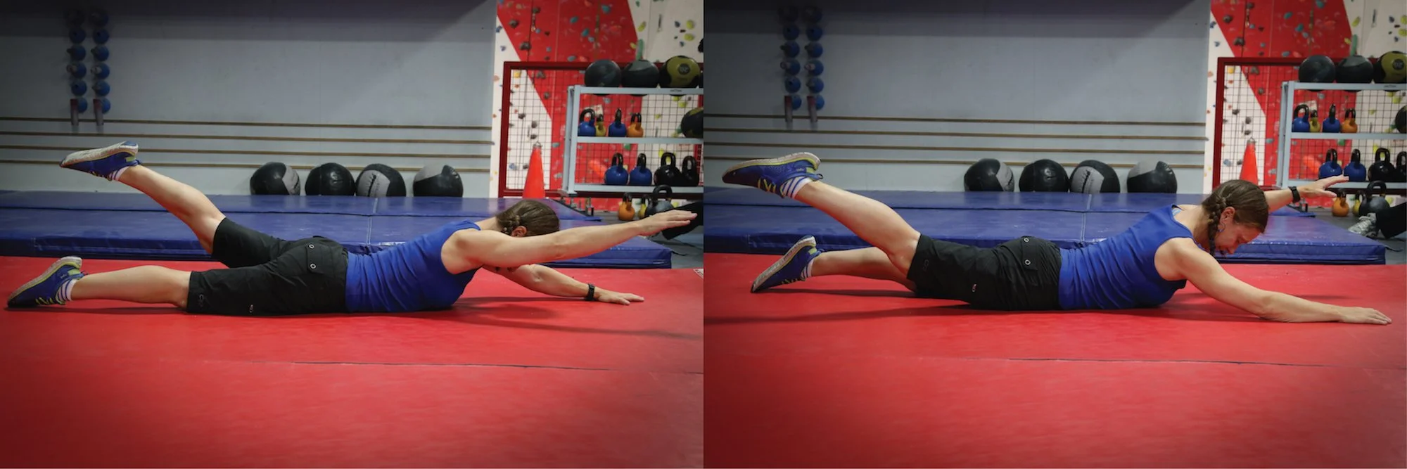 - Hold the position for 5 seconds, then lower your arm and leg back down.
